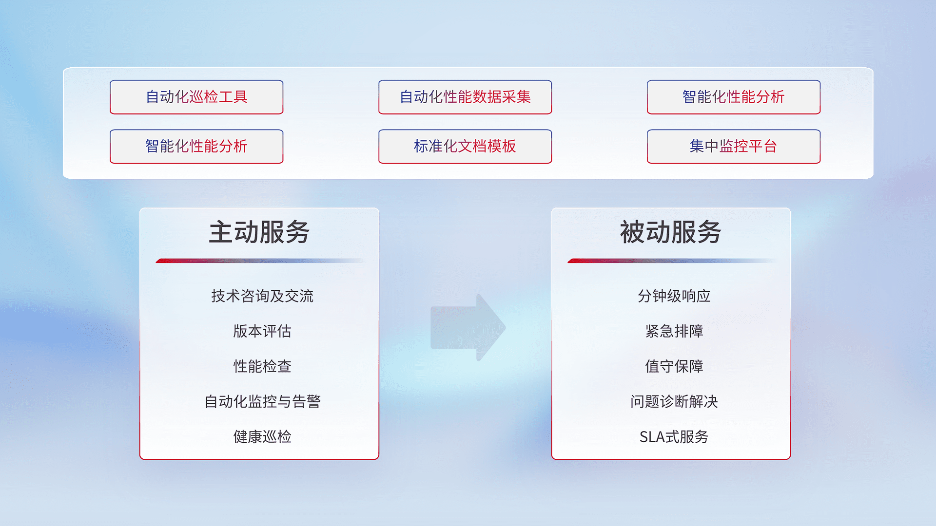 智能化工具和标准化文档,,,保障服务质量,,,,提供主动服务(包含技术咨询、、版本评估、、性能检查、、、自动化监控与告警、、、健康巡检)和被动服务包含(分钟级响应、、、、紧急排障、、值守保障、、问题诊断解决、、SLA服务)。。。。